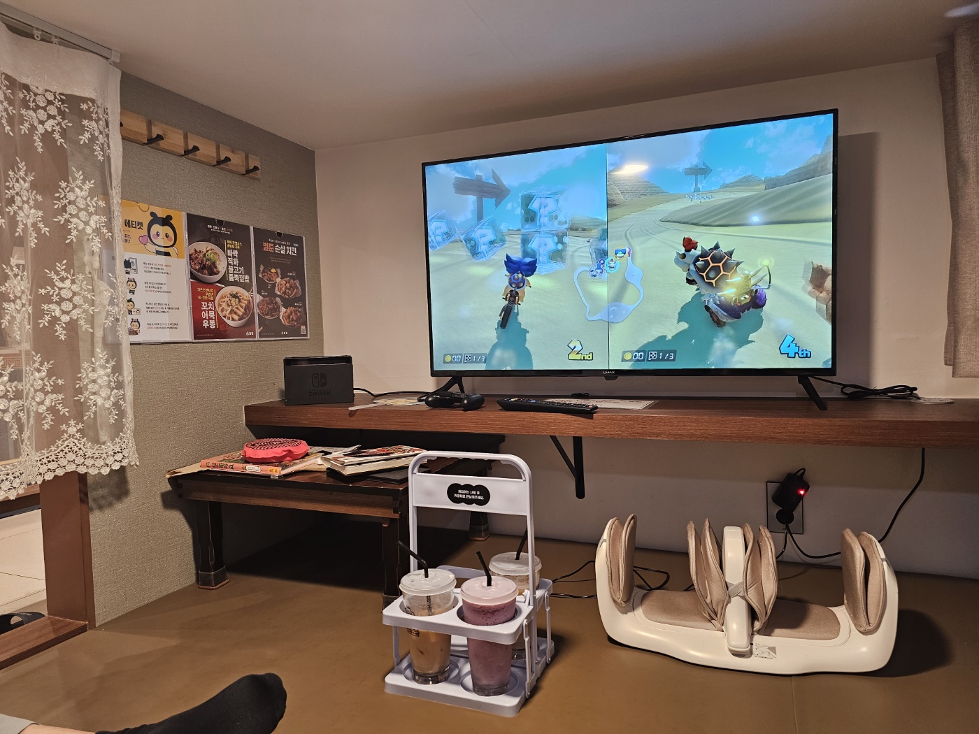 저희는 닌텐도 방에 들어갔는데 큰 TV모니터, 낮은 테이블, 편안한 쿠션 좌석, 마사지기가 마련돼 있어 프라이빗하게 시간을 보내기에 좋았습니다. 남편은 슬램덩크 만화책을 읽으며 어린 시절 추억에 빠졌고, 저희 아들은 닌텐도를 하느라 정신이 없었습니다. 저는 블루베리 스무디를 먹으며 마사지기로 다리 마사지를 받으며 힐링했습니다.